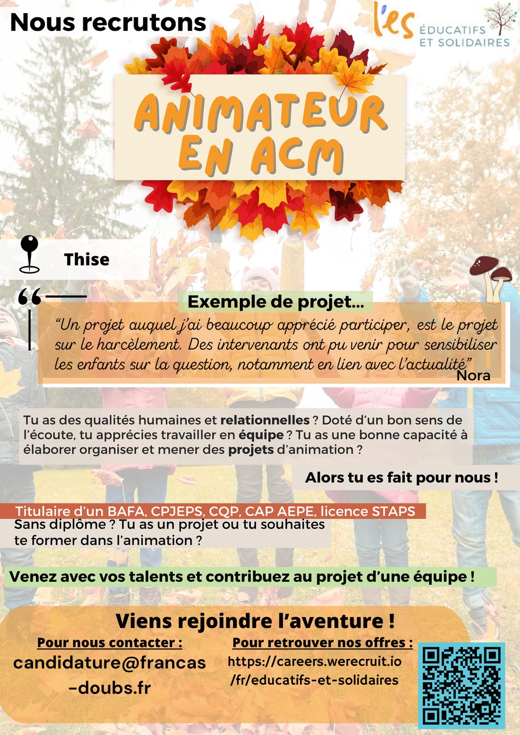 Les Francas recrutent un(e) animateur(trice) périscolaire en temps partiel à Thise :