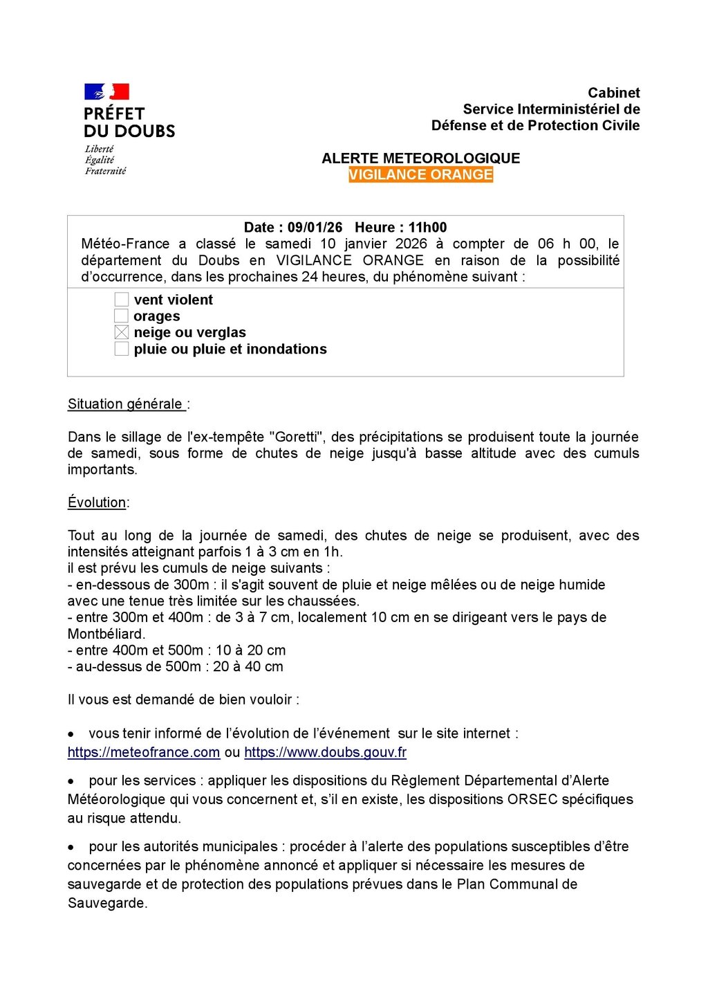 Météo-France a classé le samedi 10 janvier 2026 à compter de 6h00, le département du Doubs en vigilance orange pour un risque neige-verglas.